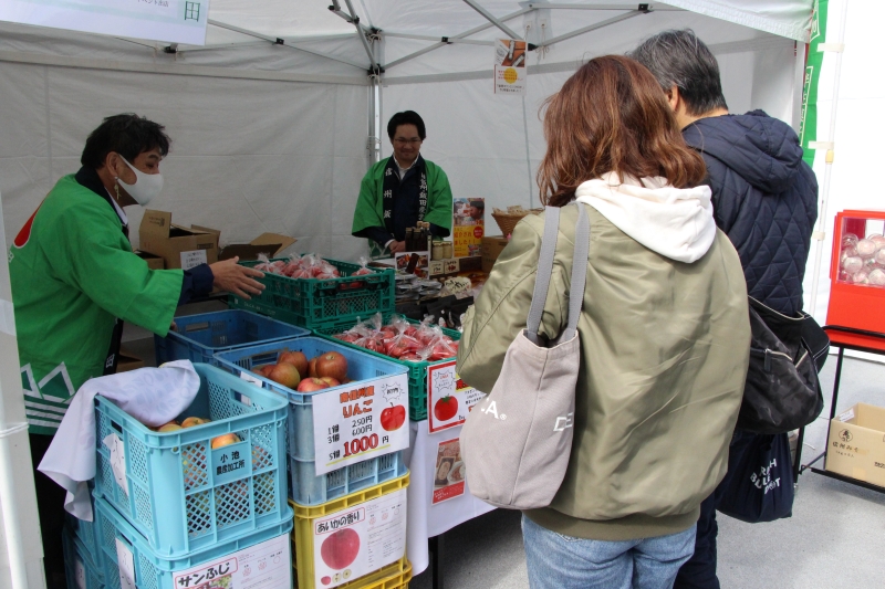 物産ブースでは、りんごやトマトなど、信州の特産品を販売し、南信州名物の「赤飯まんじゅう」も好評でした。