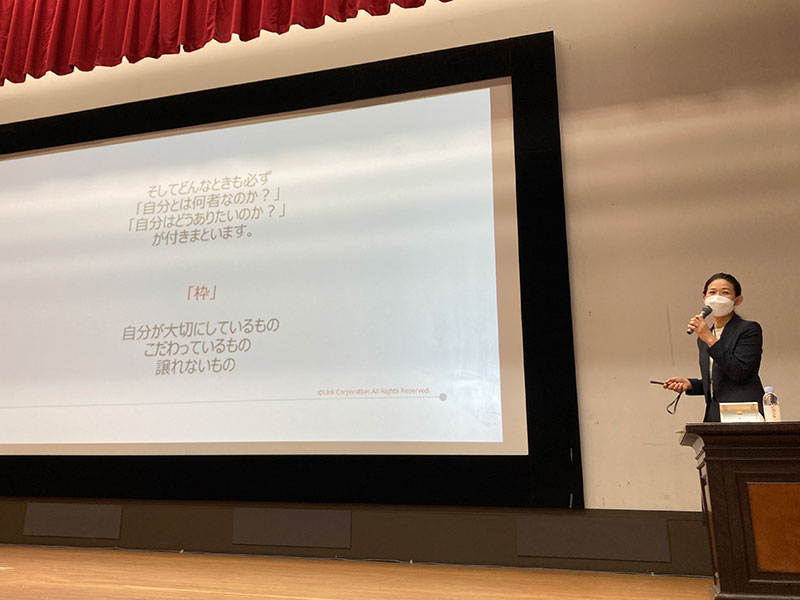 今年の総合のテーマにも含まれている「枠」。皆さんは「枠」をどのように考えているでしょうか?永井さんは講演の中で、「枠」とは「自分が大切にしているもの、こだわっているもの、譲れないもの」ではないか、とおっしゃっていました。現在は多種多様な生き方がありますが、特に女性は結婚や出産をした場合、仕事人から妻、母親へとライフステージが大きく変化します。その後さらに、地域人や介護人へと役割が変化するかもしれません。しかし、永井さんは、ライフステージや役割の変化の中で自分の「枠」にもがき、新しい「枠」を受け入れ、他者の「枠」との調和・理解に悩むことでそれらを自分の力に変えていったそうです。