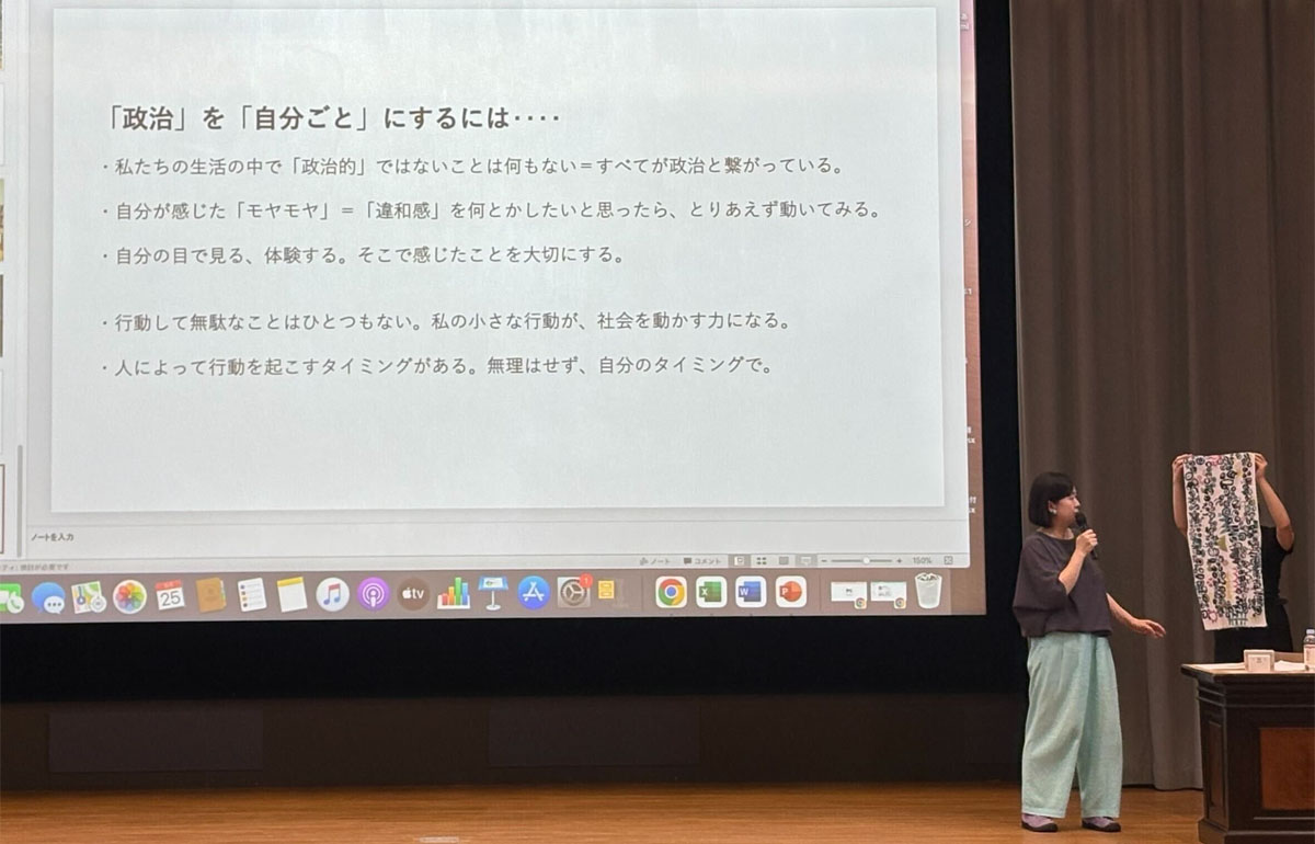 杉並区長選挙における選挙活動のお話を通して、「モヤモヤとした違和感」はただの「不安や不満」ではなく、社会や政治に関心を持つきっかけになる「大切な感覚」だと私は気づきました。普段の生活は選挙や政治と無関係のように思えても、実際は巡り巡って最終的に深くつながっていて、自分の行動や作品・創造物に反映できることが多くあるということにも気づけました。特に、モヤモヤを自分一人で抱えるのではなく他人と共有し、対話につなげることの大切さを学べました。また、すぐに大きな行動につなげられなくても、その気づきが次の一歩につながるということを知り、些細な表現や参加の積み重ねが社会を変える力になると感じました。そして、次の一歩へとつながる行動は自分のできる範囲から、簡単だと思えることでも実践してみることが大切だと考えました。