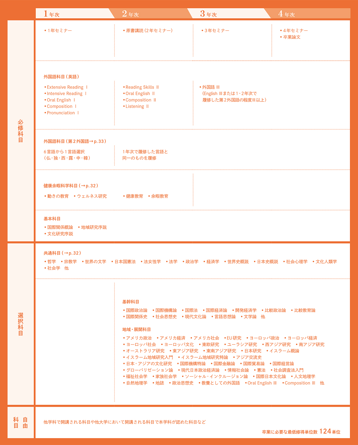 - 本学を卒業するためには4年の修業年限を満たし(編入者を除く)所定の単位を修得しなければなりません。