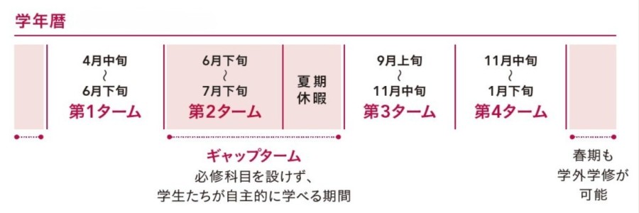 全学生が学外学修により取り組みやすくするため、2017年度より従来の2学期制から4ターム制に変更しました。必修科目がない第2タームと夏期休暇期間を「ギャップターム」と称し、6月中旬から8月末まで、最長で10週間にわたって集中的に学外で活動ができます。