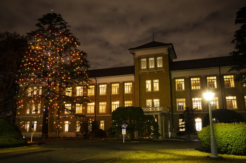 本学の冬の風物詩、ハーツホン・ホール(2001年 東京都選定歴史的建造物に指定)前のヒマラヤ杉が今年もライトアップされ、 クリスマスを前にキャンパスに彩りを加えます。