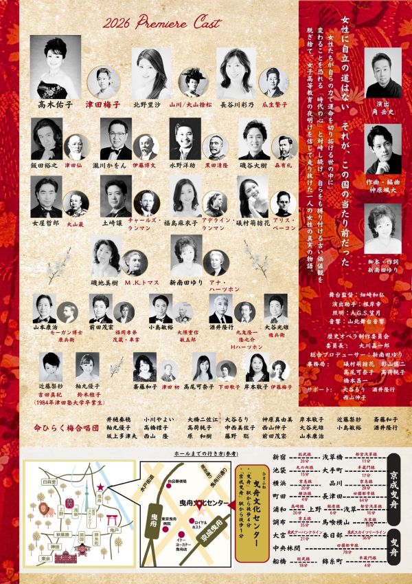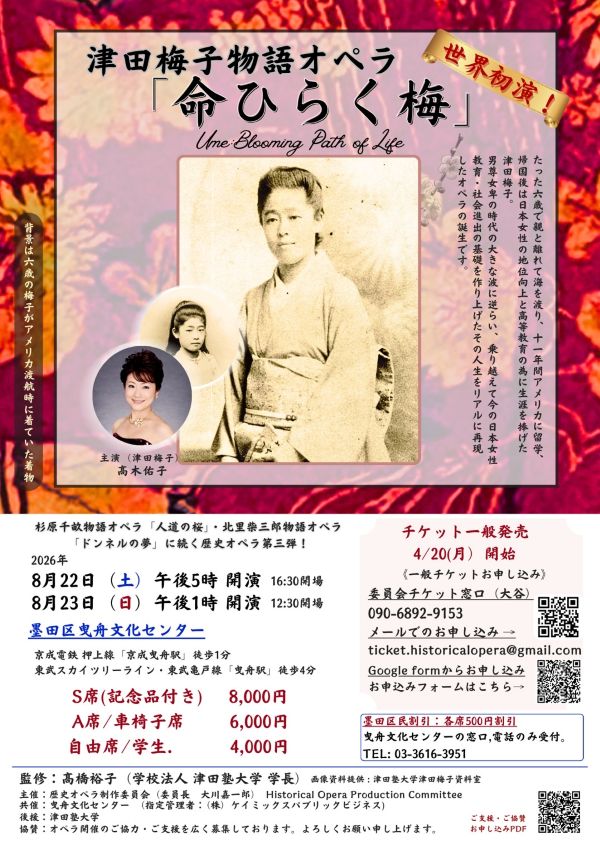 津田塾大学創立者である津田梅子を題材としたオペラが、歴史オペラ制作委員会の主催により上演されます。