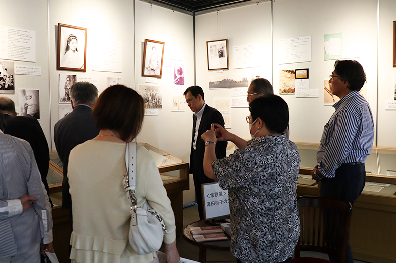 見学会は星野あい記念図書館2階津田梅子資料室展示スペースで行われ、現在開催している「創立120周年記念事業 津田梅子の小袖修復プロジェクト 中間報告」と常設展「津田梅子の生涯」 をご覧いただきました。津田梅子資料室担当室長による展示についての説明もなされ、多くの方々に津田梅子の生涯や功績をより深くお伝えすることができました。