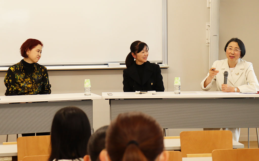 対談は本学千駄ヶ谷キャンパスで開催され、在学生も観覧する中、お二人の現在のお仕事にも活きる在学時のエピソードや、津田塾への想いを語っていただきました。