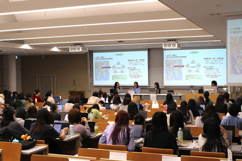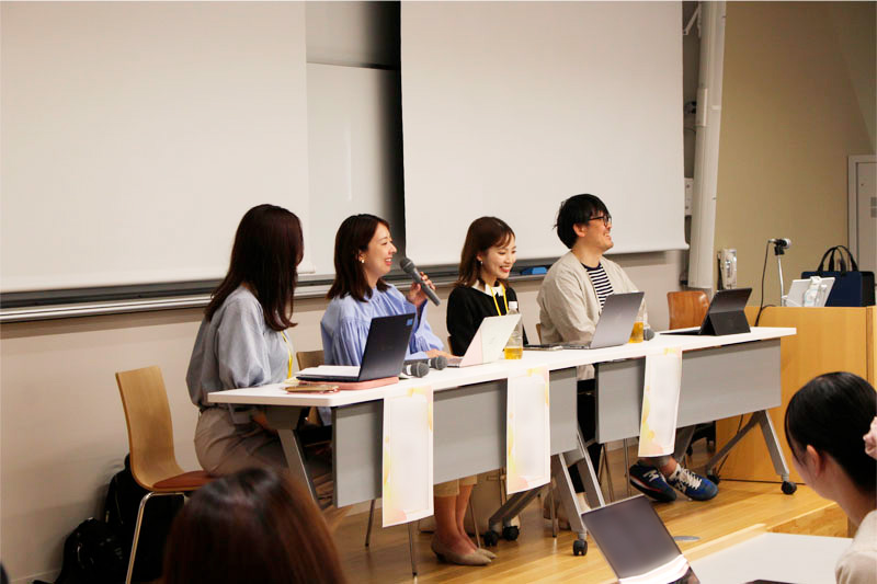 登壇者と佐々木尚之教授(総合政策学科主任)のインタビュー形式で進んでいき、「(入学時は)総合政策学部が新設されて間もない時期に、津田塾大学に進学した決め手は」、「学生時代にやっておけばよかったことや失敗談」、「いつごろ現在の業界を意識し始めたか」など、入学時から現在の社会人生活まで幅広い質問に答えていただきました。