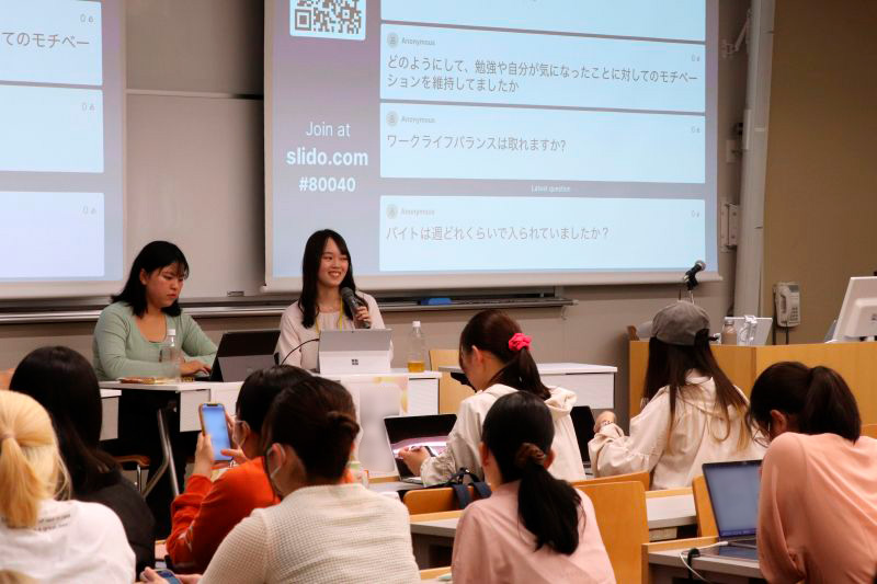 最後に新入生から、学生時代のアルバイトの経験や現在のワークライフバランスに関する質問も寄せられ、登壇者の方々は気さくに答えてくださいました。終始和やかな雰囲気で進行し、閉会となりました。