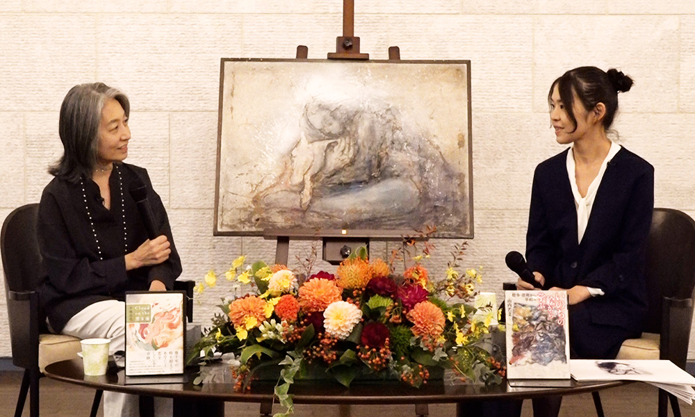 お二人は、山根記念ギャラリーで展示中のケーテ・コルヴィッツ作品との関わりやその作品が時代に与えた影響について語られました。 さらに、山内氏はコルヴィッツへのオマージュ作品を紹介しながら、 創作の過程で大切にしていること、表現を続ける中でのさまざまな障害やそれを乗り越えていく思いについて、表現者ならではの視点でお話しくださいました。